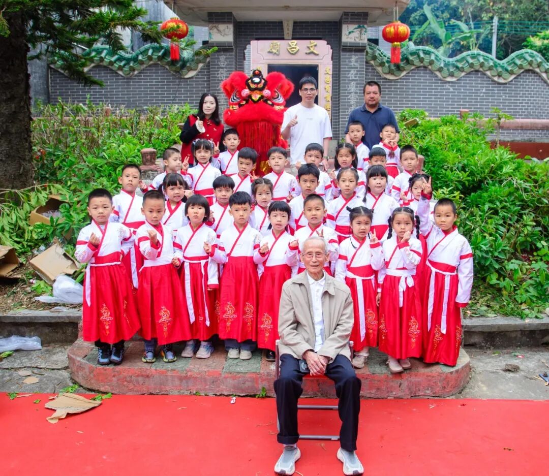 优秀学子黄宗杰和黄飞妍作“学长榜样”上台致辞。他们结合自身的求学经历,勉励后辈们要珍惜光阴,勤学善思,既要传承中华优秀传统文化,也要以开阔的视野走向世界。在他们的带领下,全体学童齐声诵读《三字经》选段,稚嫩的童声在古庙中回荡,象征着崇文重教的村风代代相传。