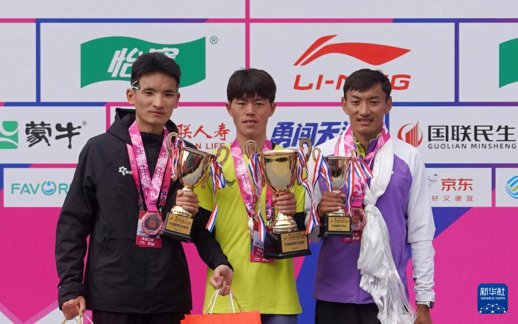 3月22日,男子国内组第一名毛金虎(中)、第二名丰配友(左)和第三名索朗才仁在领奖台上合影。