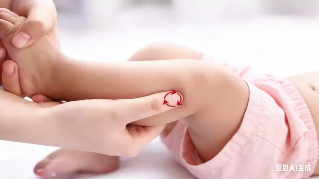 足三里在膝盖外侧凹陷下3寸(约孩子四指宽)。用指关节顺时针揉按5分钟,力度以微微酸胀为宜。能健脾和胃,扶正祛邪,增强消化能力,提高免疫力。