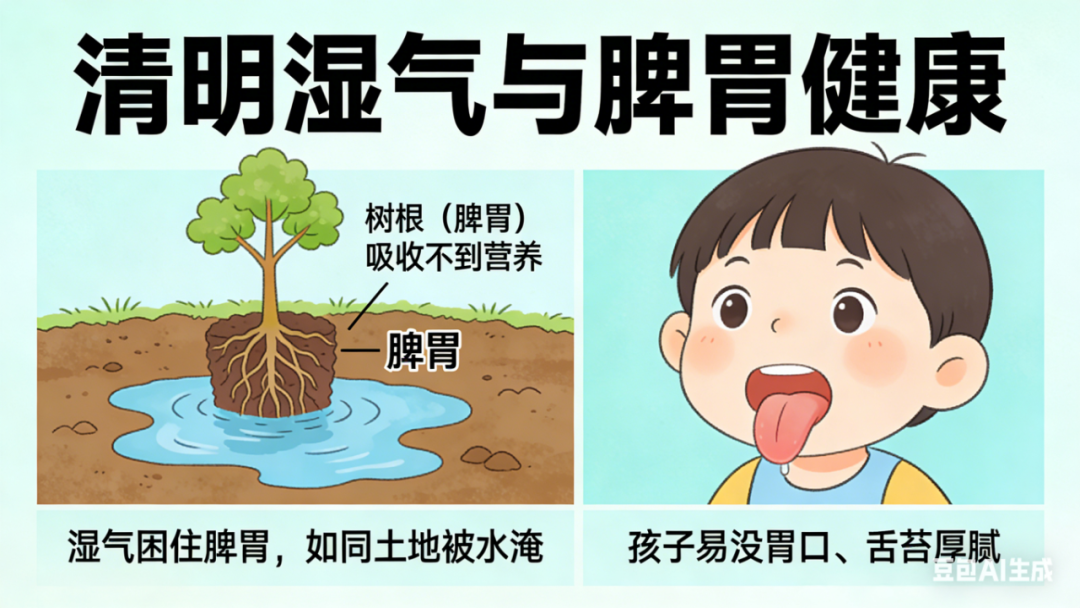 清明湿气重,湿气困住脾胃,就像土地被水淹了,小树的根(脾胃)吸收不到营养,孩子就容易没胃口、舌苔厚腻、大便黏马桶。