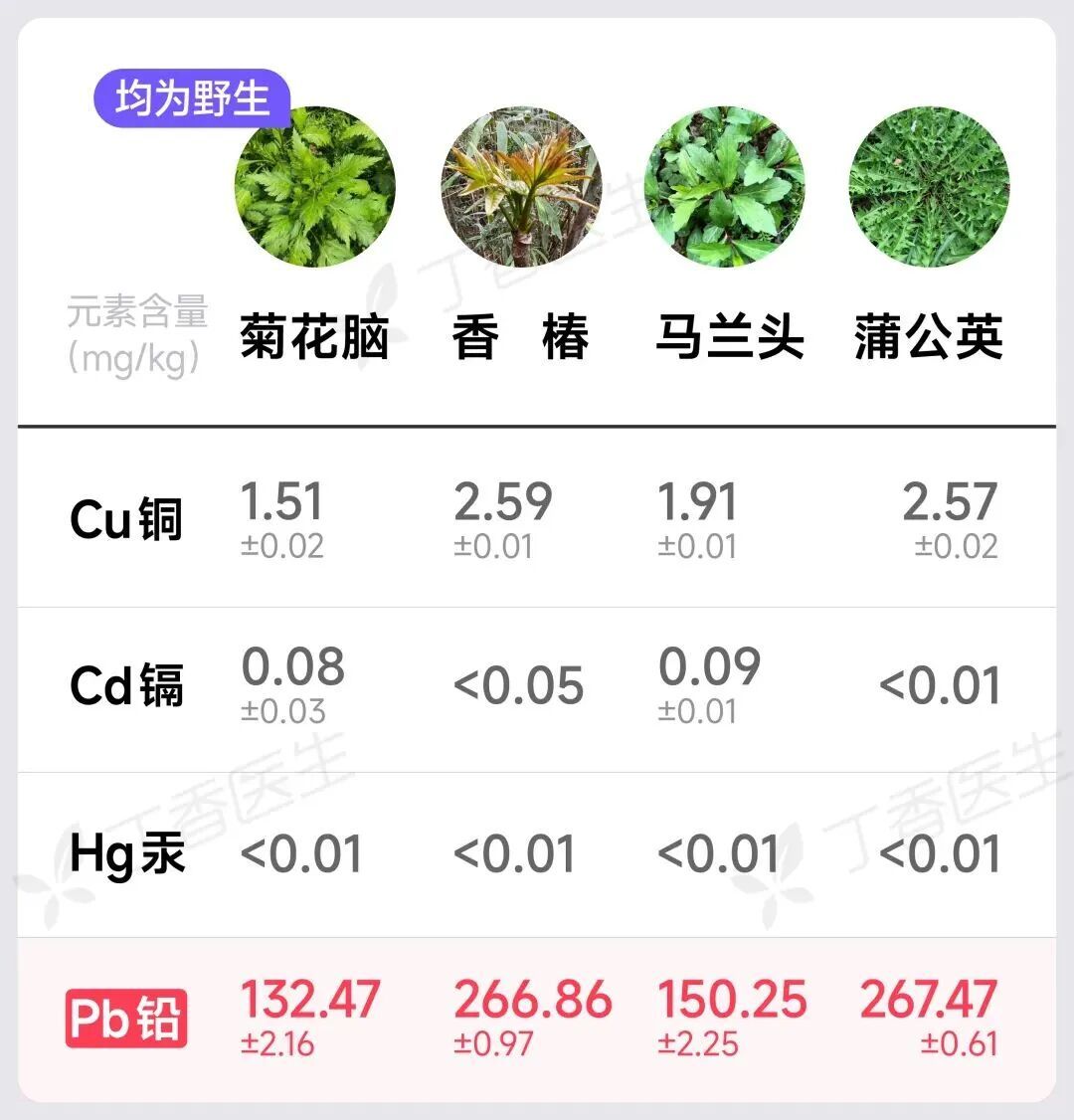 其他研究,如贵阳郊区常见野菜测定、北京市的野菜重金属含量调查等同样显示,野菜重金属含量普遍超标。