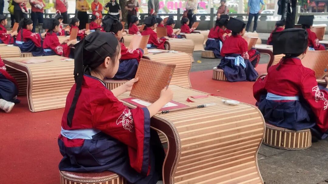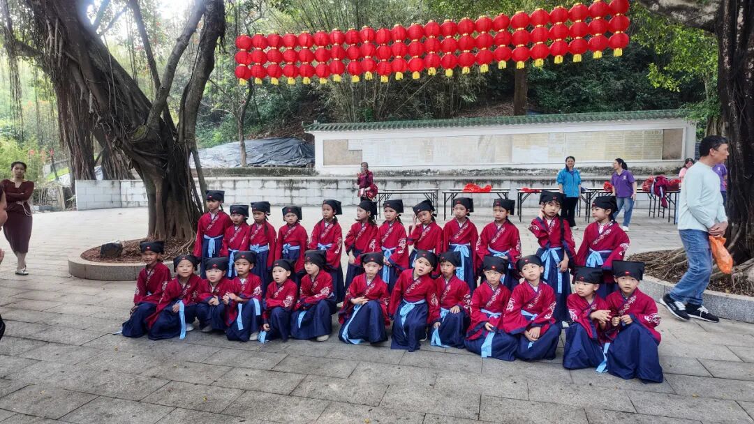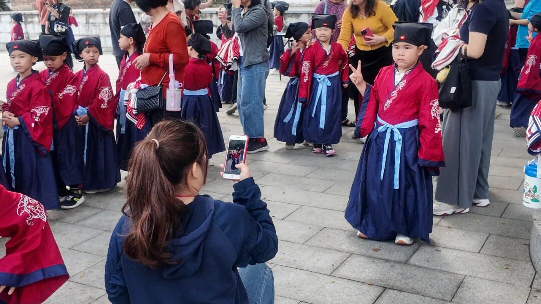 “人之初,性本善”,稚嫩而铿锵的诵读声在祖庙内回荡,孩子们跟随师长齐声诵读《三字经》经典篇章,在朗朗书声中感受传统文化的深厚底蕴。诵读完毕后,全体孩童向师长行鞠躬礼,表达对师长的尊敬与感恩,尊师重道的种子在心中悄然萌芽。