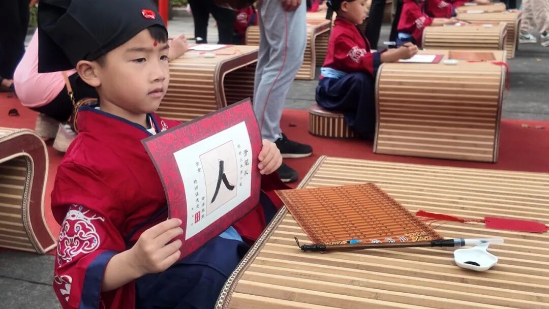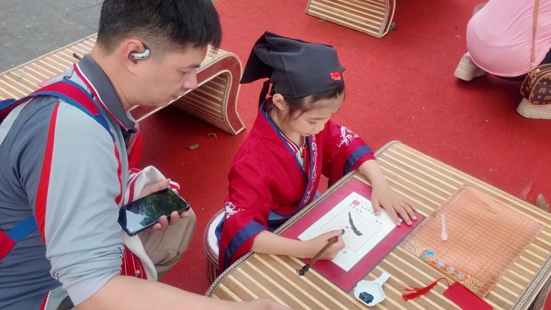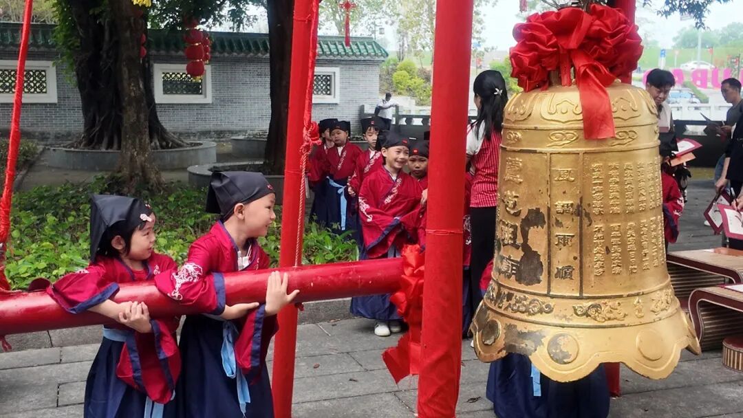 最具仪式感的 “朱砂启智” 环节,师长手持朱砂笔,在每位孩子眉心轻点红痣,寓意开启智慧、眼明心亮,祝愿孩子们从此好读书、读好书。启蒙描红环节,孩子们在指导下执笔书写 “人” 字,一撇一捺间,不仅学会书写汉字,更领悟 “做人要顶天立地” 的道理。随后的鸣钟环节,孩子们奋力鸣钟三下,洪亮的钟声传递着远大志向。