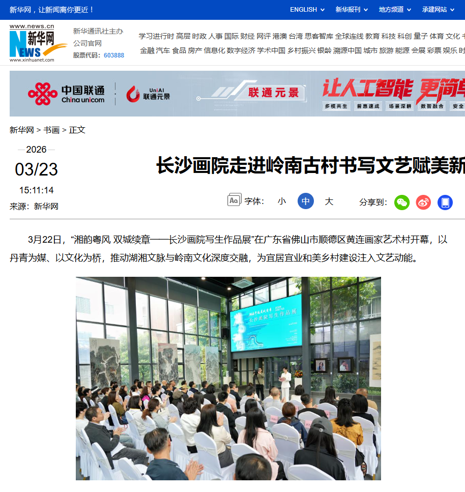3月22日,“湘韵粤风 双城续章——长沙画院写生作品展”在顺德勒流黄连画家艺术村展览馆启幕。来自湖湘与岭南的艺术名家、各界嘉宾齐聚一堂,共赏丹青雅韵,共话文化交融。