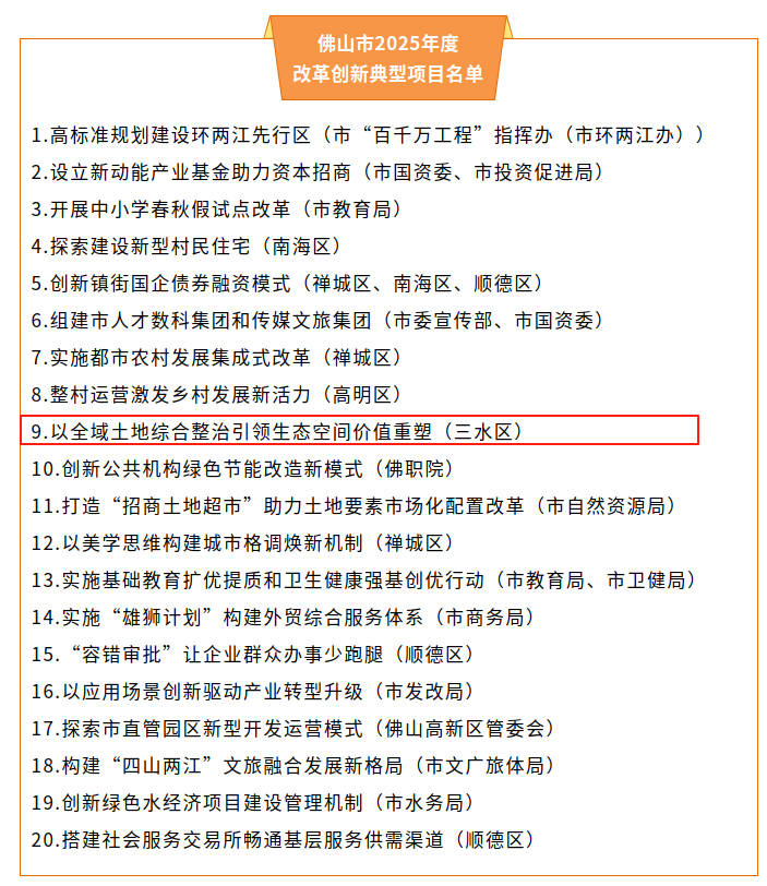 (三水区)三水区把全域土地综合整治作为优化生产力布局、激活盘活土地资源的关键一招,大胆探索破解资金瓶颈、生态价值转换的新模式,入选广东省九大典型项目。截至目前,累计开工项目56个,涉及投资67.1亿元;完成农用地整治7000亩,生态修复13000亩,新增耕地超4000亩,腾退建设用地130亩,建成“千亩方”1个、“百亩方”18个;2025年获得农发行、国开行等政策性融资授信17.67亿元。