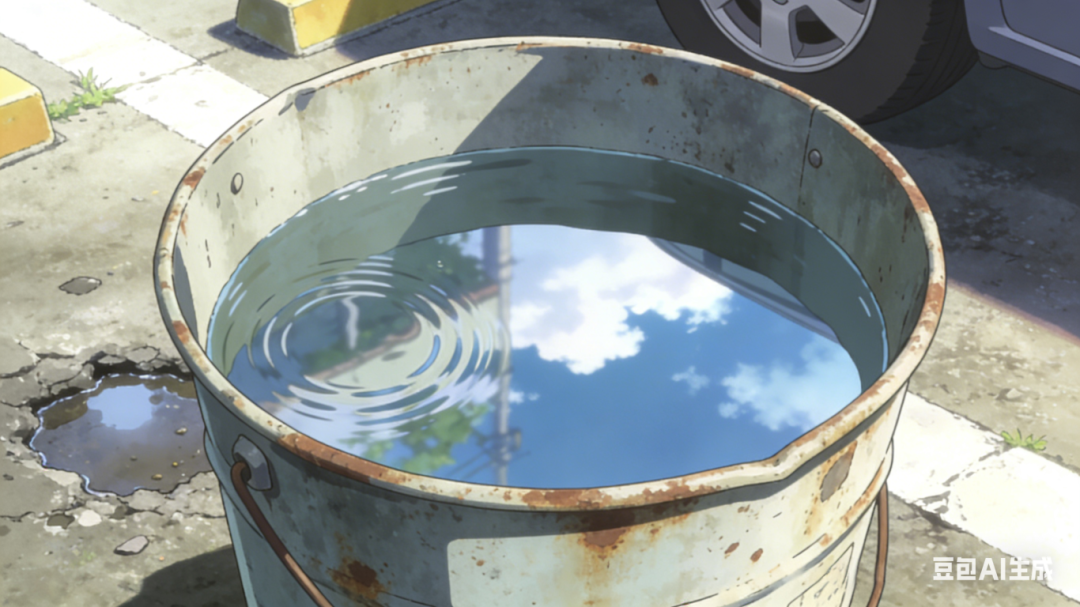 室外停车位各种坑洼小积水、废弃水桶积水。