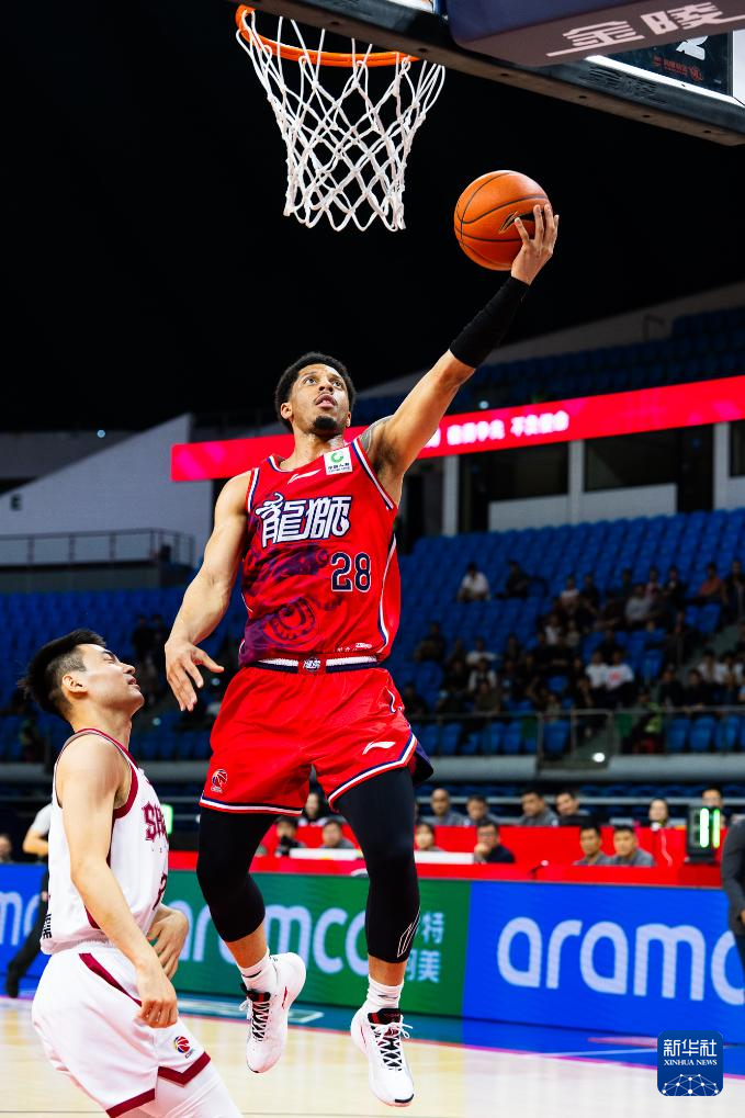 3月23日,广州朗肽海本队球员威金顿(右)在比赛中上篮。