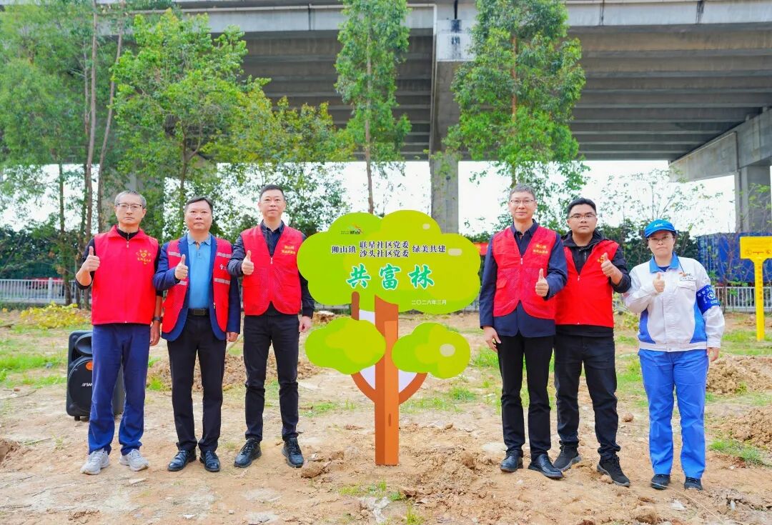 在狮山镇沙头社区,沙头社区与联星社区的党员干部群众齐聚一堂,挥锹铲土、扶苗填坑、提水浇灌,种下一片新绿,并共同为“共富林”揭牌。在西樵镇大岸村,桂城叠北社区的党员干部与当地村干部并肩协作,一株株黄花风铃在春风中稳稳立起。类似的植树场景,正在南海多地陆续展开。