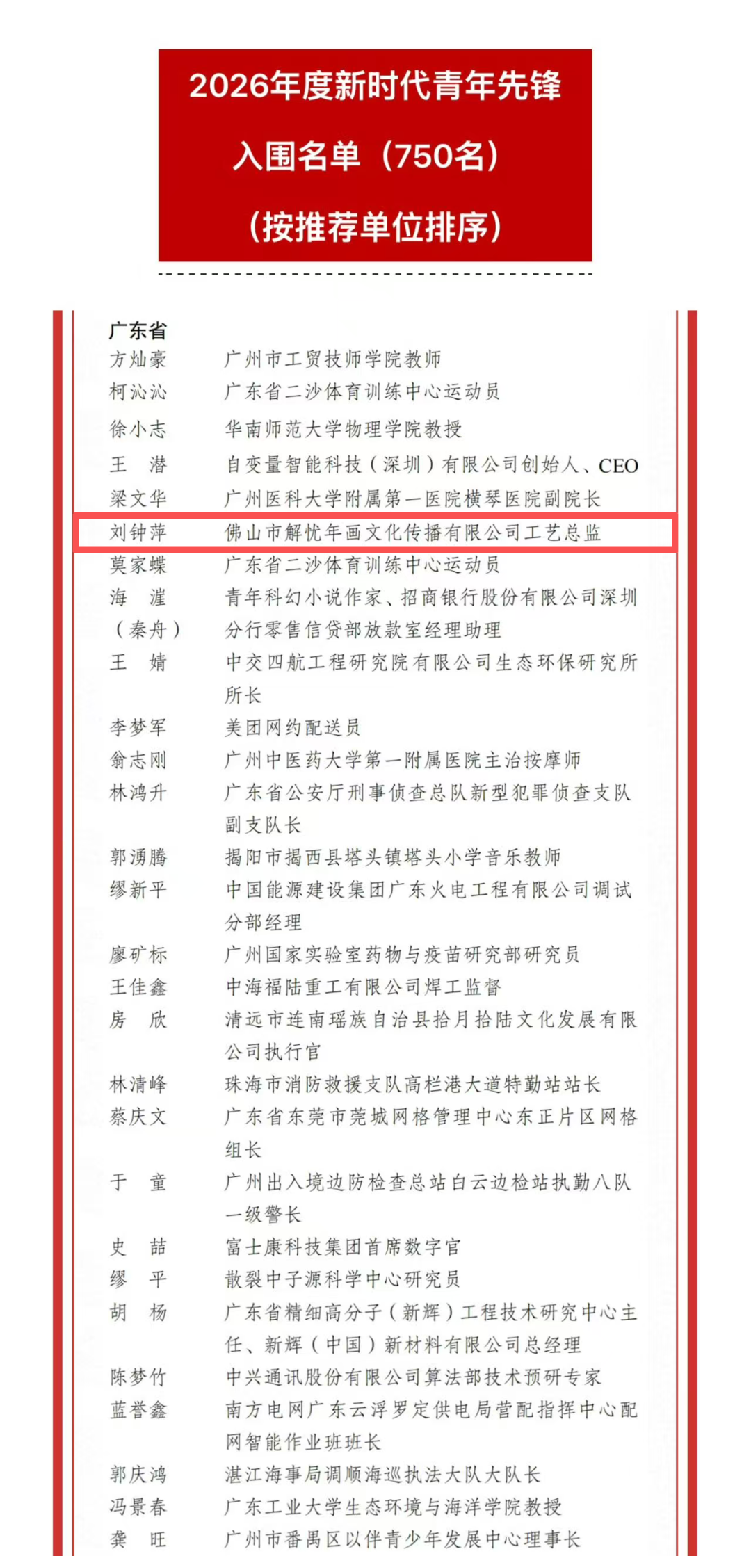 3月23日,2026年度中国青年五四奖章暨新时代青年先锋奖入围名单正式公示。在新时代青年先锋奖入围名单中,广东共有28人入围,其中来自禅城的“年画女侠”刘钟萍榜上有名,成为佛山唯一入围者。