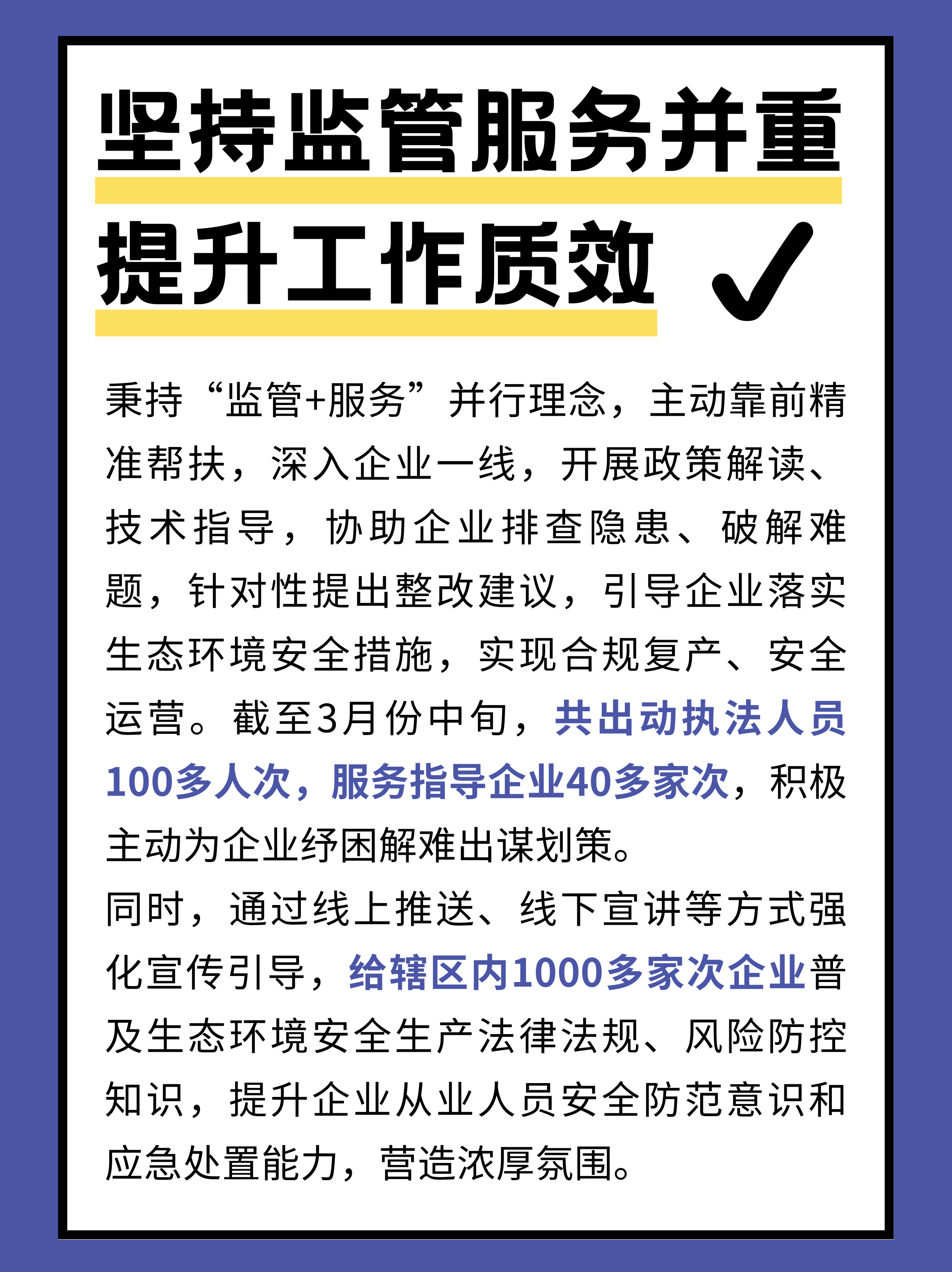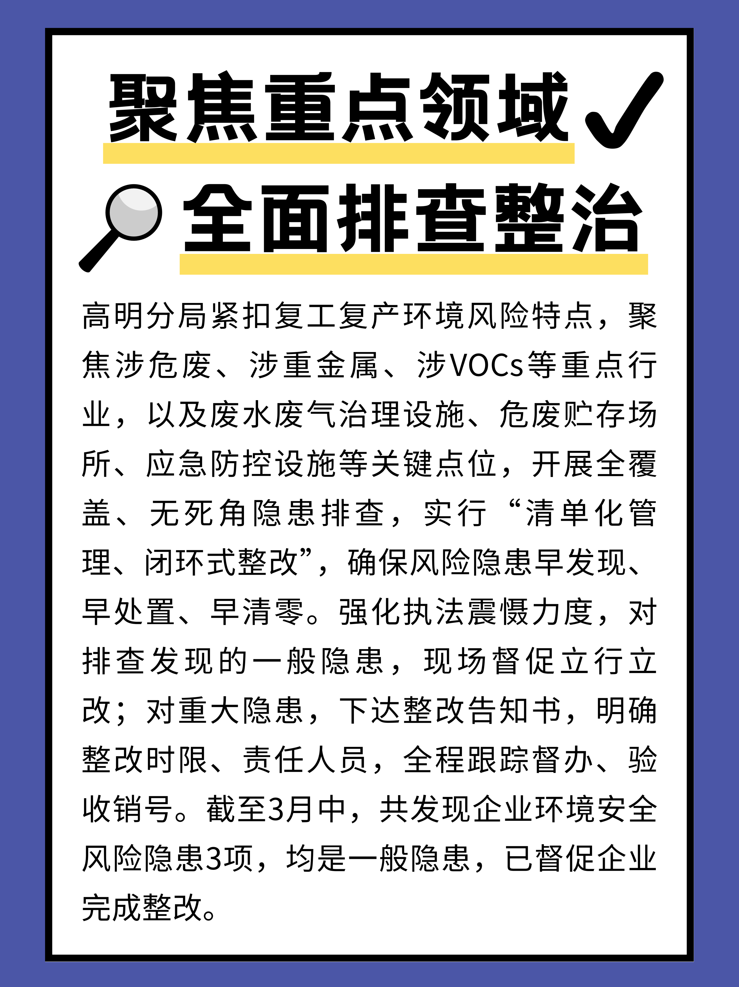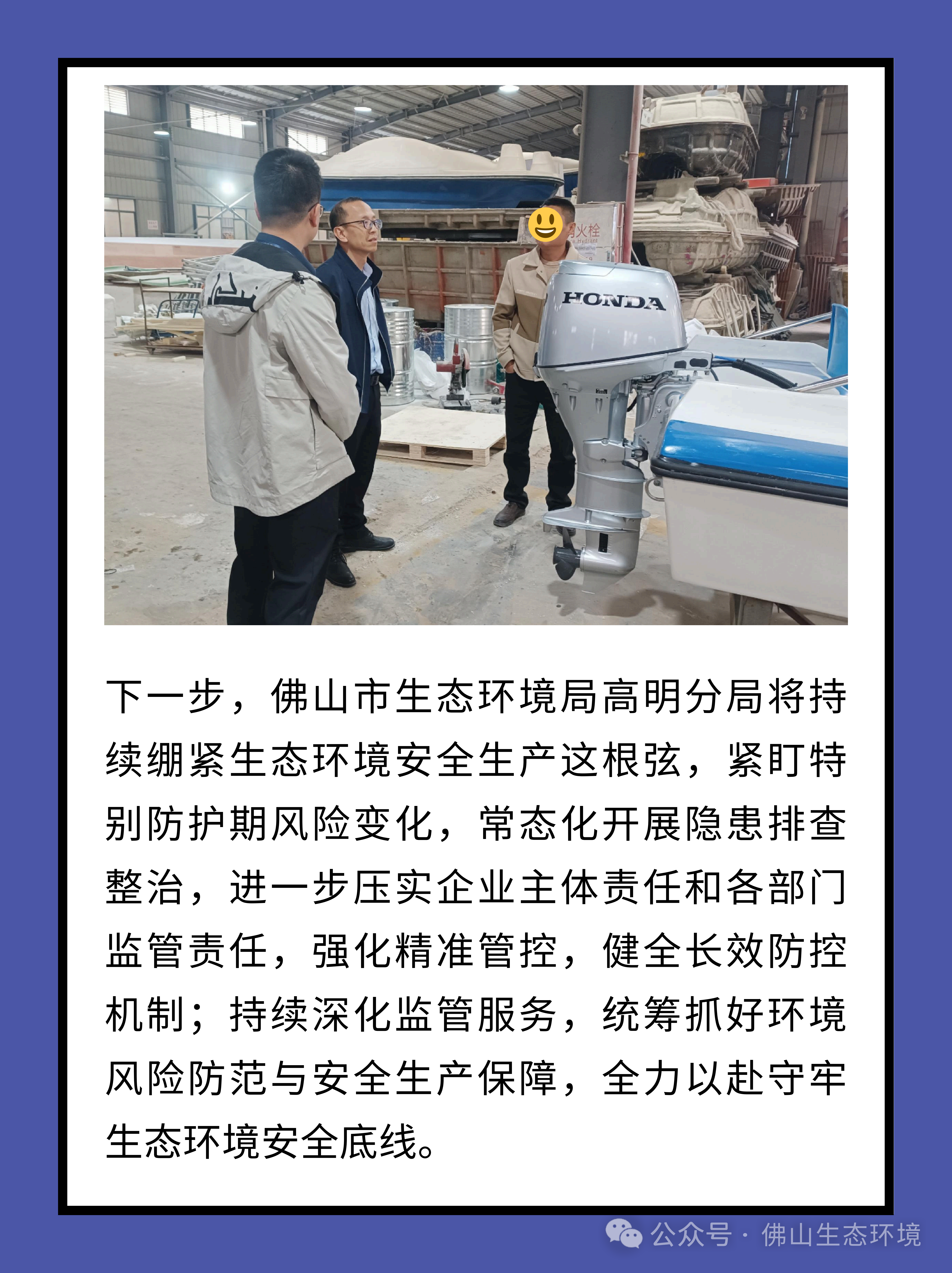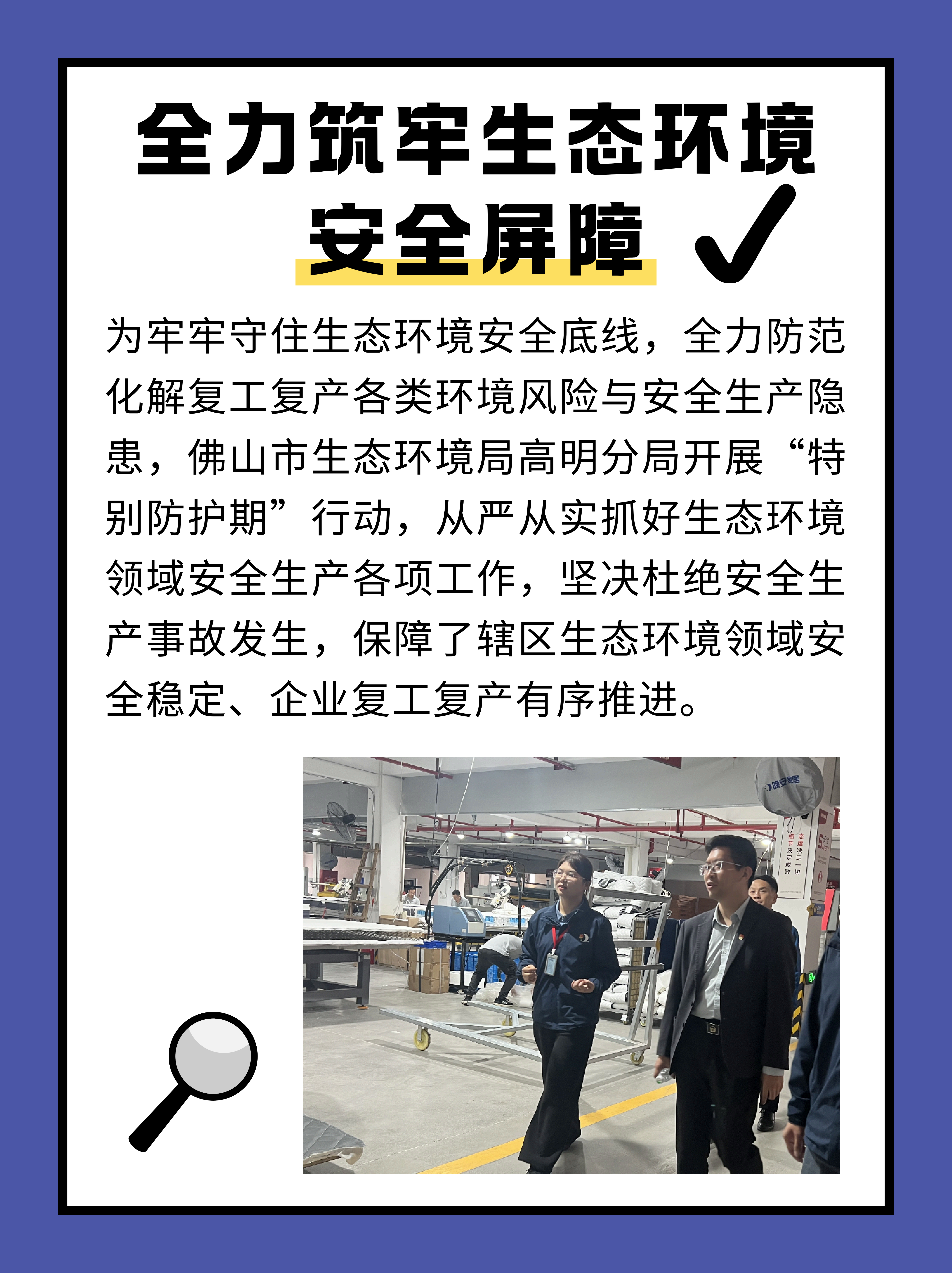近日,佛山市生态环境局高明分局开展“特别防护期”行动,从严从实抓好生态环境领域安全生产各项工作,全力筑牢生态环境安全屏障;聚焦重点领域,全面排查整治;坚持监管服务并重,提升工作质效。下一步,高明分局将持续绷紧生态环境安全生产这根弦,进一步压实企业主体责任和各部门监管责任,全力以赴守牢生态环境安全底线。