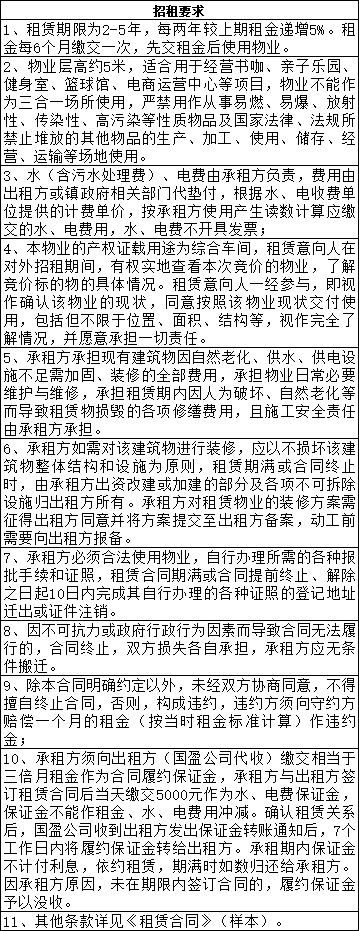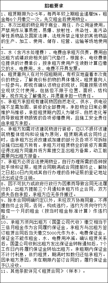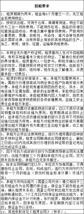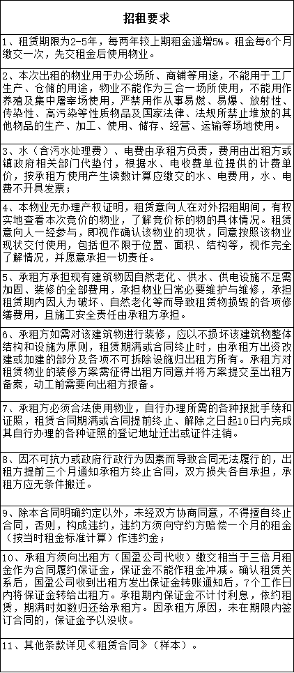 1.凡有意租赁本次公开招租物业的申请意向人须按招租条件在报名时间内到佛山市三水区国盈资产管理中心有限公司报名,签订有关竞价文件,并按竞价文件的要求缴交履约保证金。