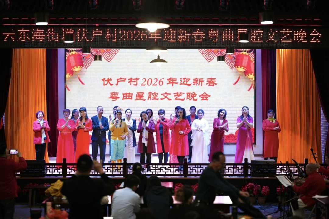 伏户村坐落于云东海街道南部,总面积6平方公里,下辖欧南村、伏水村等12条自然村,常住人口达5100人,是非遗粤曲星腔发源地、星腔创始人“小明星”邓曼薇的故里。2025年,该村村组两级集体经济收入超1600万元,股民平均分红超3000元。