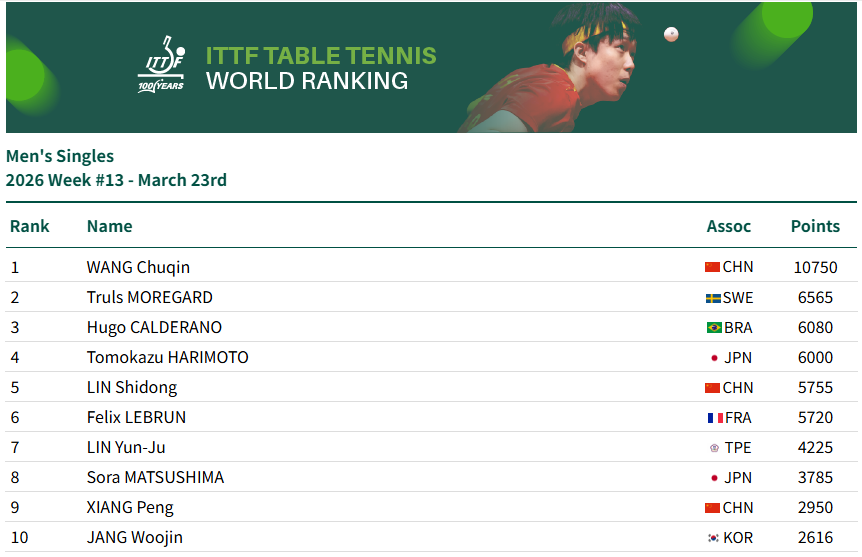 3月23日,国际乒联公布2026年第13周世界排名,林诗栋位列第五名。