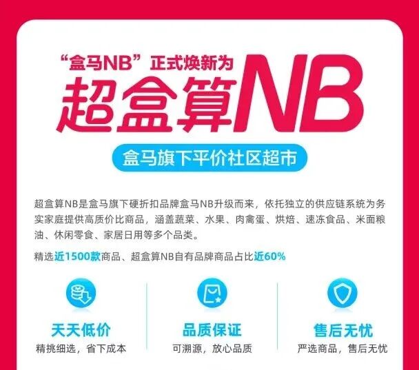 据介绍,“超盒算NB”是盒马孵化的硬折扣店品牌,2025年8月29日由“盒马NB”更名而来。“超盒算”寓意商品价格划算,“NB”则代表Neighbor Business(邻里商业)。