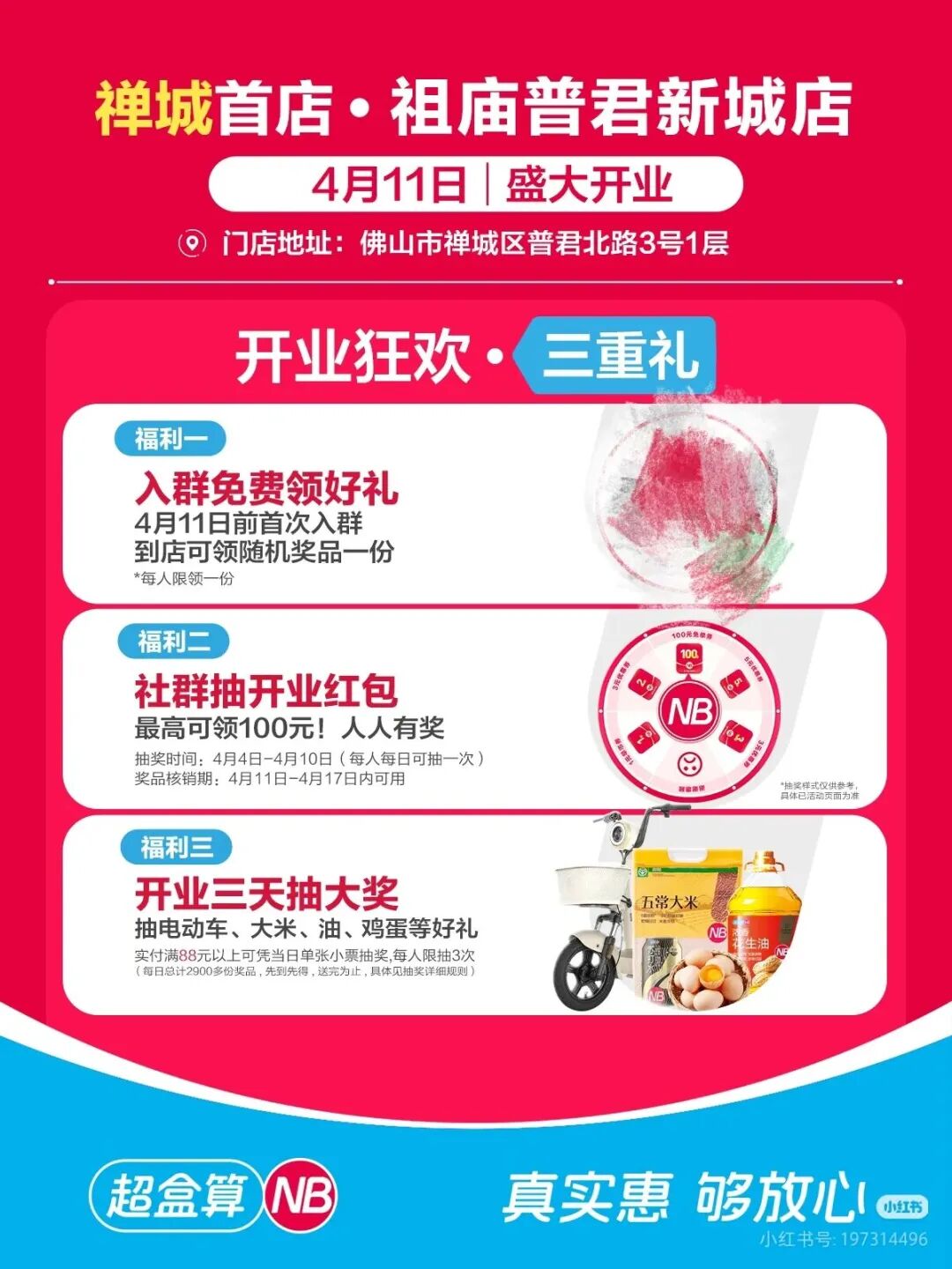 开业期间,门店推出三重礼活动:入群免费领好礼、社群抽开业红包,以及开业三天内抽奖送出电动车、大米、油等奖品。目前超盒算NB小程序已有普君新城店定位显示。