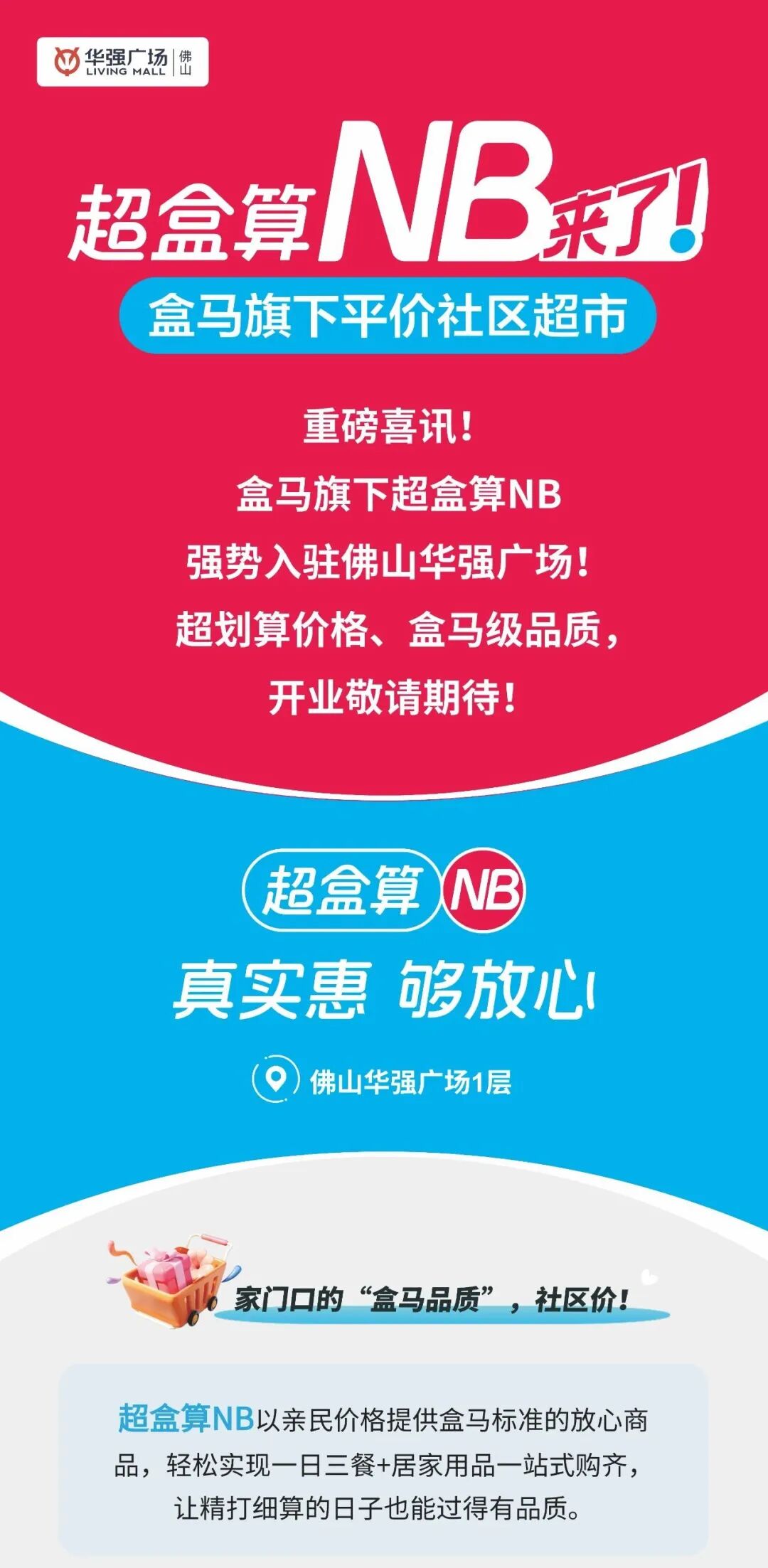 简单而言,超盒算NB是盒马旗下的平价社区折扣店,主打便宜、近、刚需;盒马鲜生是中高端新零售大店,主打品质、全品类、即时配送。
