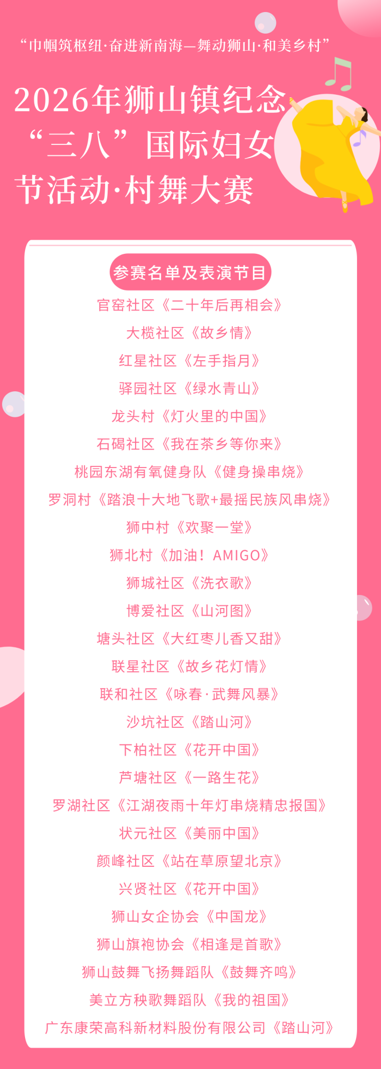 3月27日(周五)晚 村舞大赛决赛将在博爱湖举行 快来为我们“大狮姐”加油 3月27日,“巾帼筑枢纽·奋进新南海—舞动狮山·和美乡村”2026年狮山镇纪念“三八”国际妇女节活动·村舞大赛即将举行,同时也是“招商青雲臺杯”2026年佛山市南海区村舞大赛狮山镇季赛的揭幕战。来自全镇的妇女舞蹈爱好者将齐聚博爱湖,以舞为媒,跳出乡村振兴的精气神。 大赛面向村(社区)、“三新”领域妇联组织、企业、社会组织等组队报名。3月以来,在狮山镇各村(社区)妇联主席的组织发动下,村民群众、企业、社会组织踊跃参与,共68支队伍积极投稿,通过视频赛展开激烈比拼后,最终27支队伍成功晋级季赛决赛。 决赛将于3月27日(周五)晚在狮山镇博爱湖线下开跳,入围队伍抽签决定出场顺序,由专业评委现场打分,决出一、二、三等奖及优秀奖。 官窑社区排练照。 沙坑社区排练照。 驿园社区排练照。 兴贤社区排练照。 他们“备战”得如何? 快来看看其中两支 晋级队伍的近期状态 颜峰社区舞蹈队: 女干部带队,跳出“牛仔”精气神 这支队伍有点特别,16名队员,平均年龄51岁,成员大多是丹邱经济社的妇女,平日聚在一起跳跳舞就是最大的快乐。但这次,她们要站上更大的舞台了。值得一提的是,队伍由一位女村支书和一位女理事长“挂帅出征”,从“领着村民干”到“带着姐妹跳”,她们笑称:“这回不当村干部,就当舞伴!” 颜峰社区排练照。 颜峰社区的舞蹈氛围向来浓厚,下属十个经济社就有7支舞蹈队,平日里正月十一醒狮盛会等社区节庆活动,总能看到她们的身影。这次为了备战村舞大赛,她们专门对参赛节目《站在草原望北京》进行了“大改造”,在保留原有豪迈风格的基础上,大胆融入牛仔风元素,把草原的辽阔跳出了乡村的活力。队员们说:“我们要让大家看看,颜峰的姐妹既有草原的奔放,也有狮山的硬气!” 联星社区舞蹈队: 用非遗乐安花灯舞出故乡情! 联星社区舞蹈队这次集结了18名队员,最大年龄66岁,是一支名副其实的“狮姐级”队伍。但别小看她们,为了这次比赛,联星妇联主席孙丽燕带领执委队伍,发动舞蹈爱好者参与,村民们说:“跳舞不分年纪,有情怀就能跳!” 联星社区排练照。 她们的参赛节目《故乡花灯情》绝对走心。从音乐到旁白,全由社区妇联和队员自编、自导、自演,更是巧妙融合古风花伞与联星乐安花灯,用花伞的优雅别致,凸显出花灯的传统韵味,沉浸式展现三百余年非遗,传递故乡情与美好祝福。 舞台上,她们手持花灯,舞步轻盈,仿佛把观众带回了那个花灯亮起、乡音袅袅的老街巷。一位队员动情地说:“我们跳的不只是舞,是对这片土地的念想。花灯亮了,心就暖了。” 3月27日19:00 博爱湖畔,舞林争霸 精彩不容错过! 一起去为她们打call吧! 掌握狮山最新资讯↓ 来源:南海融媒记者 梁慧恩 编辑:佛山新闻网 杜嘉雯 审核:李仁生、何欣祺、韩世荣 分享 点点赞舞动狮山,巾帼争霸!