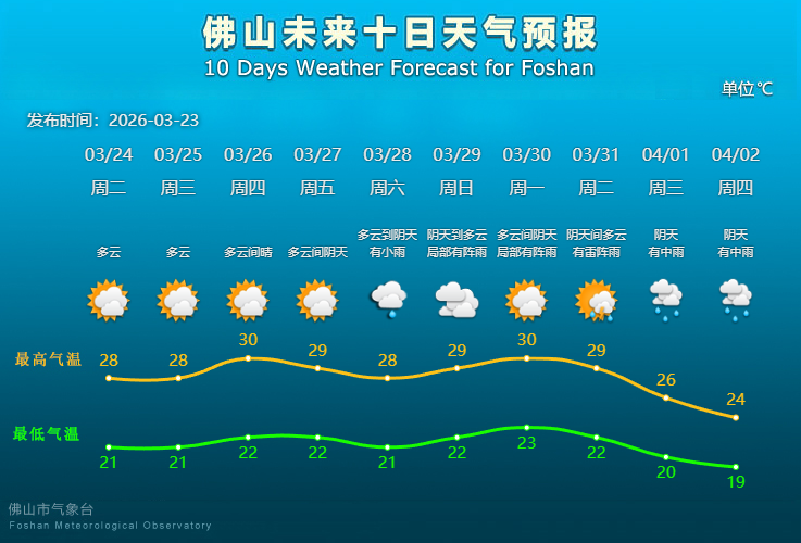 3月30日,多云间阴天,局部有阵雨,气温23℃~30℃。