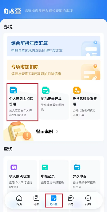 1.登录【个人所得税APP】,点击首页下方【办&查】,进入【个人养老金扣除管理】功能。