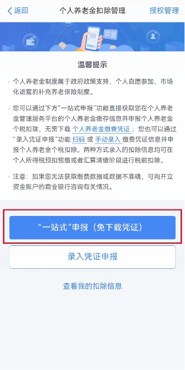 2.请认真阅读“温馨提示”,选择【“一站式”申报(免下载凭证)】。