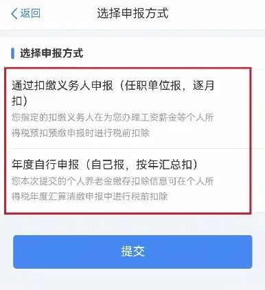 4.进入【选择申报方式】页面,若凭证类型是“月度”,则可以选择【通过扣缴义务人申报】或【年度自行申报】;其中,选择【扣缴义务人申报】的,还需选择相应的扣缴义务人。若凭证类型是“年度”,则仅可选择【年度自行申报】一种申报方式。确认无误后,即可提交申报信息。