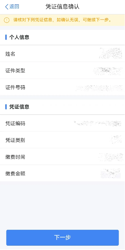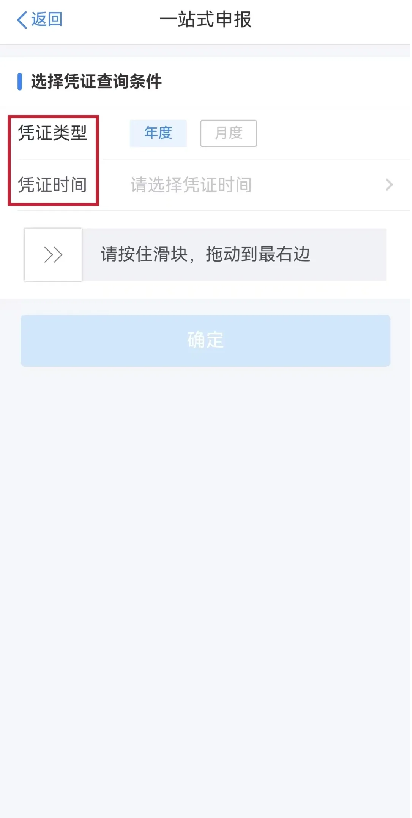3.根据实际情况,选择【凭证类型】和【凭证时间】,滑动验证条点击【确定】,查询本人有效的个人养老金缴费凭证信息,确认无误后,点击【下一步】。