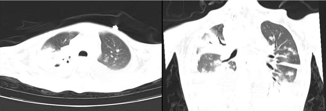 小月的肺部多发斑块影,累及多肺叶伴胸腔积液、肺空洞