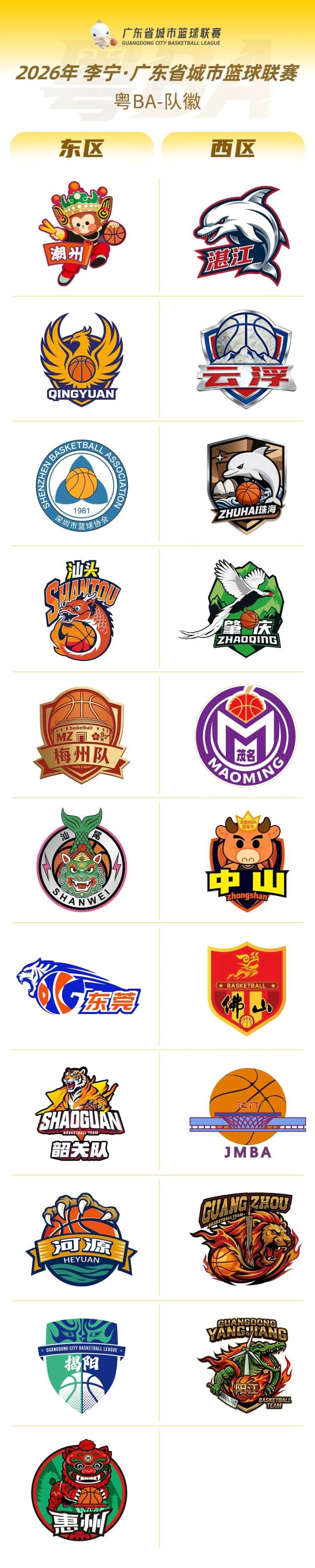 2026年广东省城市篮球联赛(“粤BA”)21支球队公布队徽,