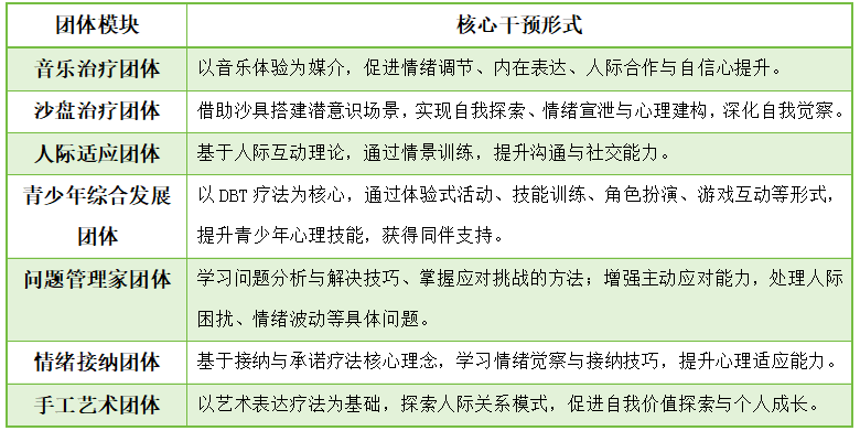 每期团体将基于青少年的评估结果与实际需求,制定针对性干预方案,从以下专业模块中选取3个团体模块系统性整合干预。心理治疗师全程专业引导,鼓励青少年真实表达、自在参与,不苛求“完美”表现~