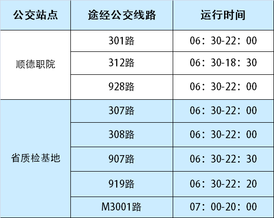 该片区500米范围内共设置2个公交站点,其中顺德职院(公交站)共有3条线路,省质检基地(公交站)共有5条线路。