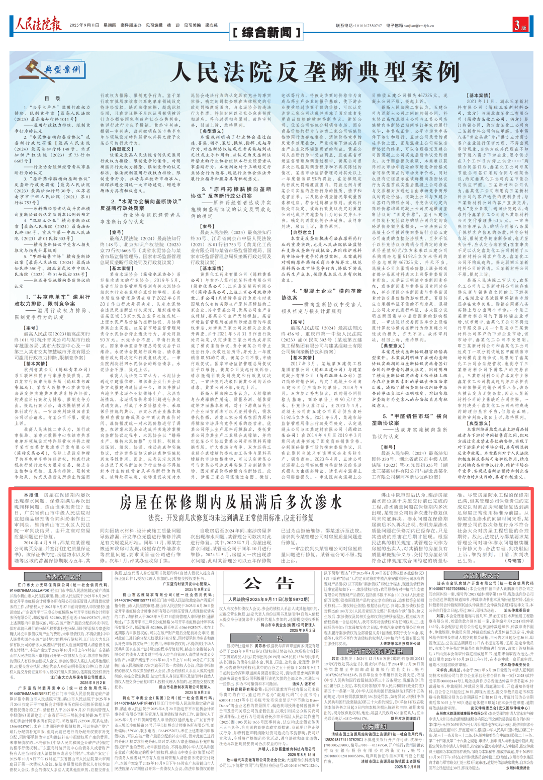1.《房屋在保修期内及届满后多次渗水 法院:开发商几次修复均未达到满足正常使用标准,应进行修复》(9月)