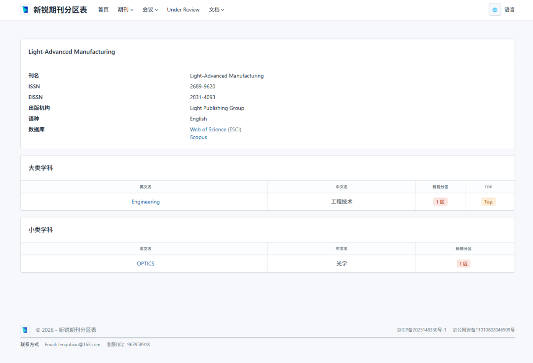2026年3月24日,由新锐学术研制的《新锐期刊分区表》(简称“新锐分区”)正式发布。由季华实验室主办、中国科学院长春光学精密机械与物理研究所Light学术出版中心出版的《Light: Advanced Manufacturing》(以下简称LAM)凭借卓越的学术影响力,成功入选工程技术大类(Engineering)及光学(Optics)细分领域的Q1区,再度彰显了国产科技期刊的领军实力。