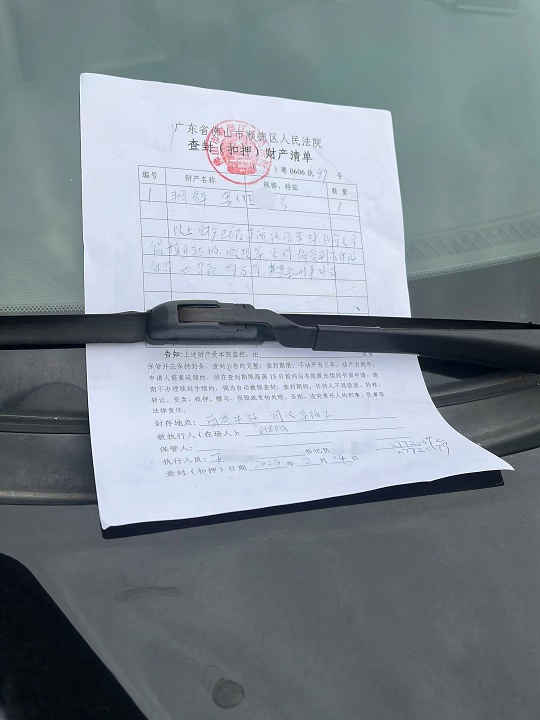 顺德区某车辆被顺德区人民法院工作人员现场查封扣押车辆。原因是:该车辆长期拖欠停车费被起诉,法院判决该被告车主支付停车费、利息和律师费,该车主仍然拒不履行,被顺德区人民法院冻结被告车主银行账户、包括微信、支付宝等账号,即时查封并扣押其名下财产。