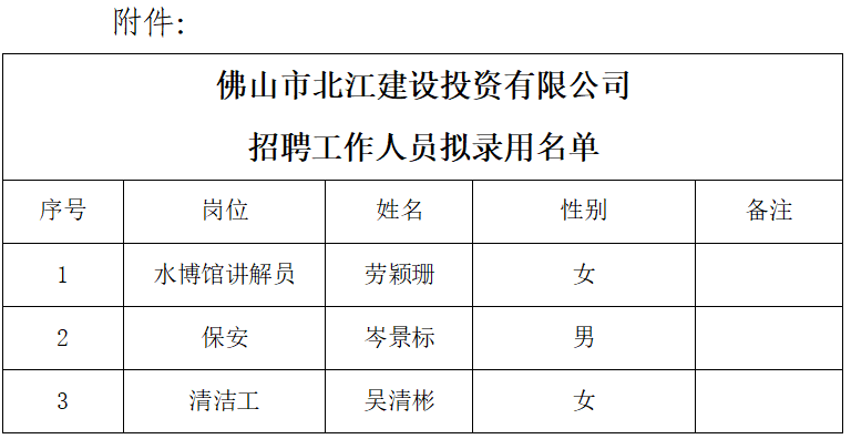 # 佛山市北江建设投资有限公司 招聘工作人员拟录用名单公示 根据《佛山市北江建设投资有限公司招聘水博馆讲解员公告》及《佛山市北江建设投资有限公司招聘保安及清洁工公告》相关要求,经资格审查、面试、体检、政审等程序,确定劳颖珊等同志为佛山市北江建设投资有限公司招聘工作人员拟录用人选,现予以公示。 公示时间:2026年3月25日—2026年3月31日。 如有异议,请在公示期内向佛山市北江建设投资有限公司反映,监督电话:0757-87232991。 佛山市北江建设投资有限公司 2026年3月25日