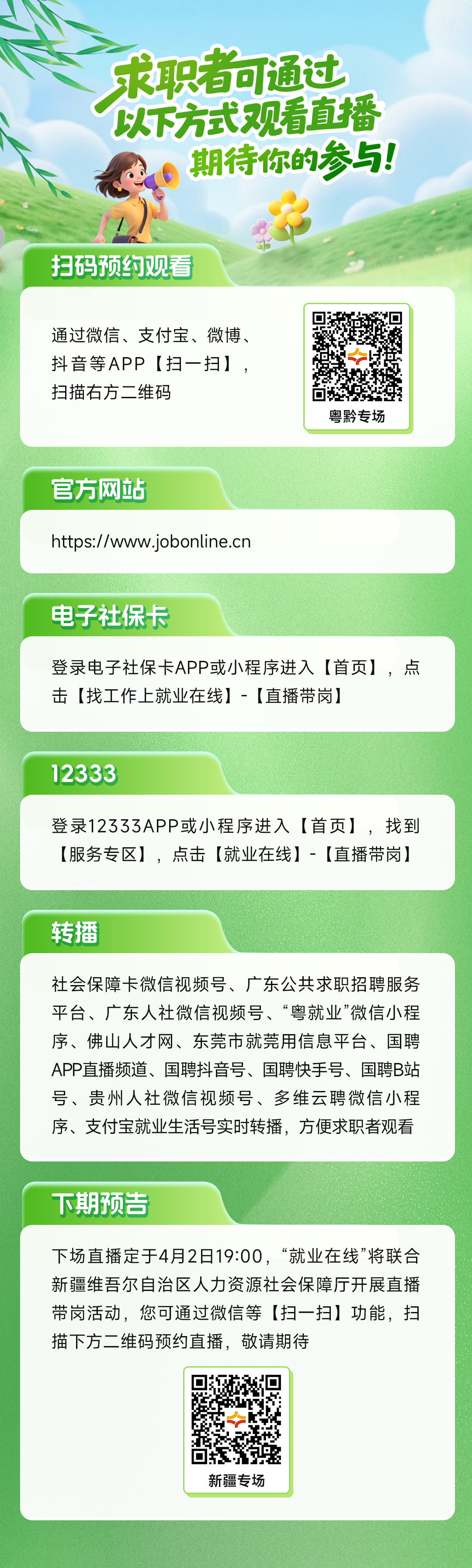 “春风送岗促就业 真情相助暖民心”,2026年春风行动火热进行中,“就业在线”平台开展春风行动暨就业援助季跨省劳务对接系列直播带岗活动。3月26日19:00,“就业在线”平台携手广东省、贵州省人力资源社会保障厅开展春风行动暨就业援助季跨省劳务对接粤黔专场直播,为您带来权威政策解读、优质岗位推介、专业求职指导,助力广大求职者就业。