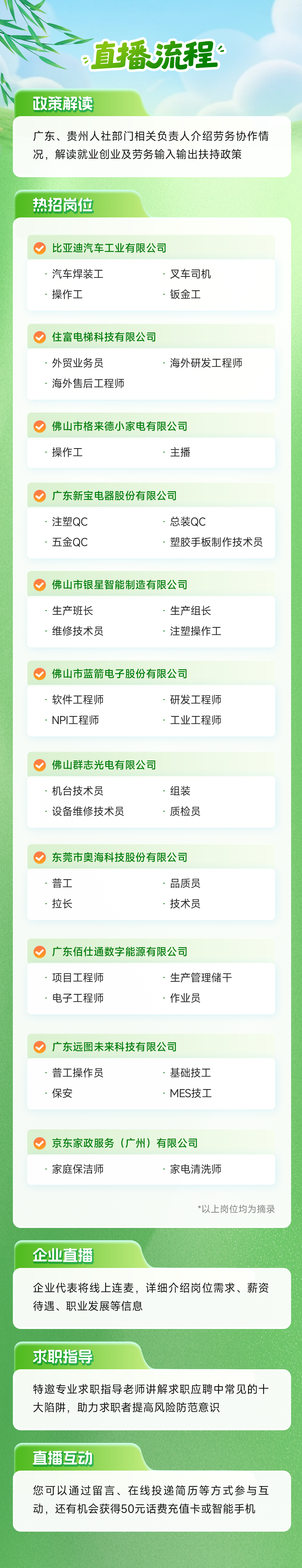 本场活动共有11家企业参与直播,覆盖制造业、居民服务、修理和其他服务业等行业,为农民工等广大求职者提供汽车焊装工、叉车司机、钣金工、生产班长、组装工、普工等生产操作性岗位,研发工程师、软件工程师、项目工程师、电子工程师、维修技术员、机台技术员等专业技术类岗位,以及质量管控员、外贸业务员、生产管理储备干部、主播、保洁、保安等众多岗位。心动不如行动,赶快来参与吧!