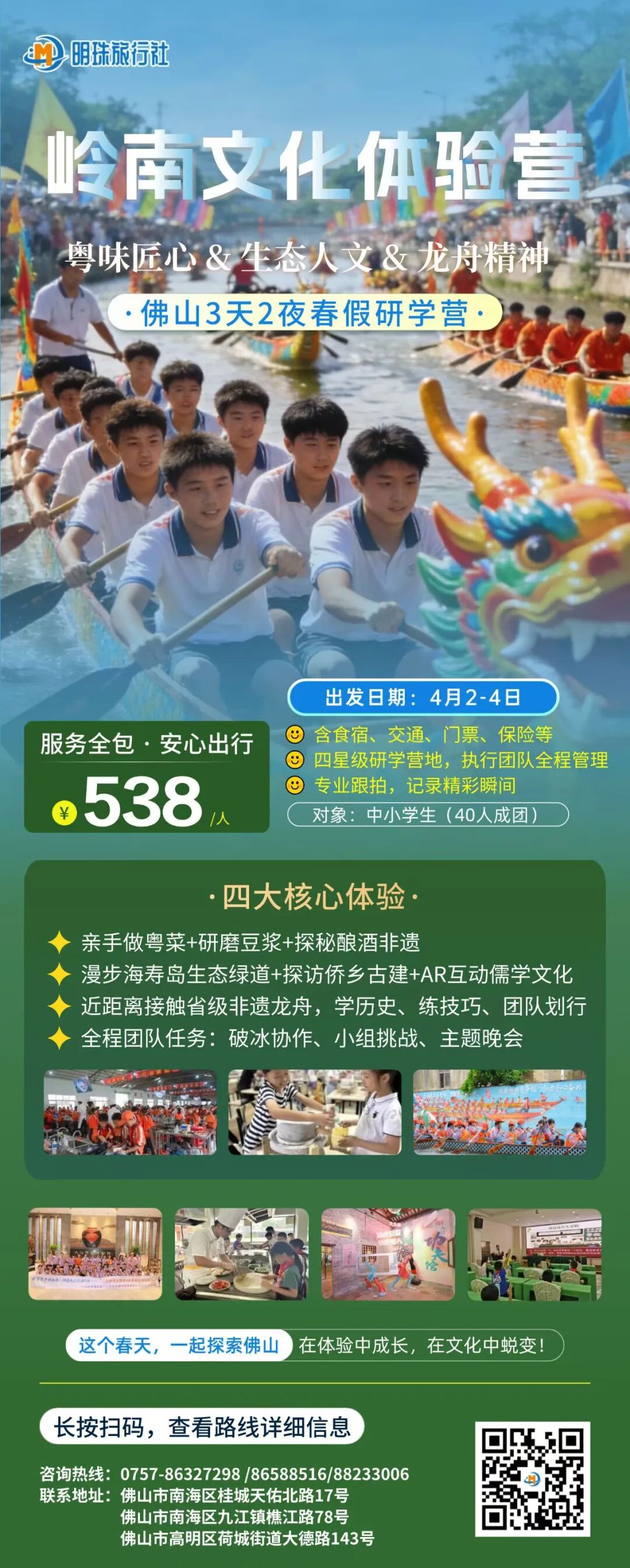 佛山中小学即将迎来春假! 4月2日至3日放假2天 衔接清明假期(4月4日至6日) 形成五天小长假 春假去哪玩?就来九江! 九江3天2夜春假研学营 现正火热招募中 扒龙舟、逛江岛、访古建 探酒厂、做粤菜、学知识 全部一站包揽! 还有多条九江龙舟研学游路线 九姑娘也收集好啦! 收藏好带娃冲~ 美食+生态+人文+龙舟 九江春假研学营抢先看! 九江三天两夜春假研学营,将于4月2日至4日热闹开营!粤菜技艺学习、生态人文探索、龙舟文化体验,这趟研学之旅,统统安排上啦! ✅粤味匠心体验:在粤菜师傅培训基地学习粤菜刀工、食材认知、豆浆研磨、粤点烘焙;探访九江双蒸博物馆,追溯米酒酿造的非遗技艺。 往期活动精彩瞬间。 九江双蒸博物馆。 ✅行走的课堂:海寿岛环岛徒步观察西江生态,走进吴家大院解读侨乡历史,在朱九江公园体验互动,实现自然观察与历史认知双向提升。 海寿岛。摄/宋兹檀 吴家大院。摄/梁平 朱九江公园。 ✅非遗龙舟体验:在敦根社区了解龙舟的起源、传统仪式与制作工艺,亲身参与登舟体验,感受团结协作、拼搏奋进的龙舟精神。 敦根社区。摄/梁平