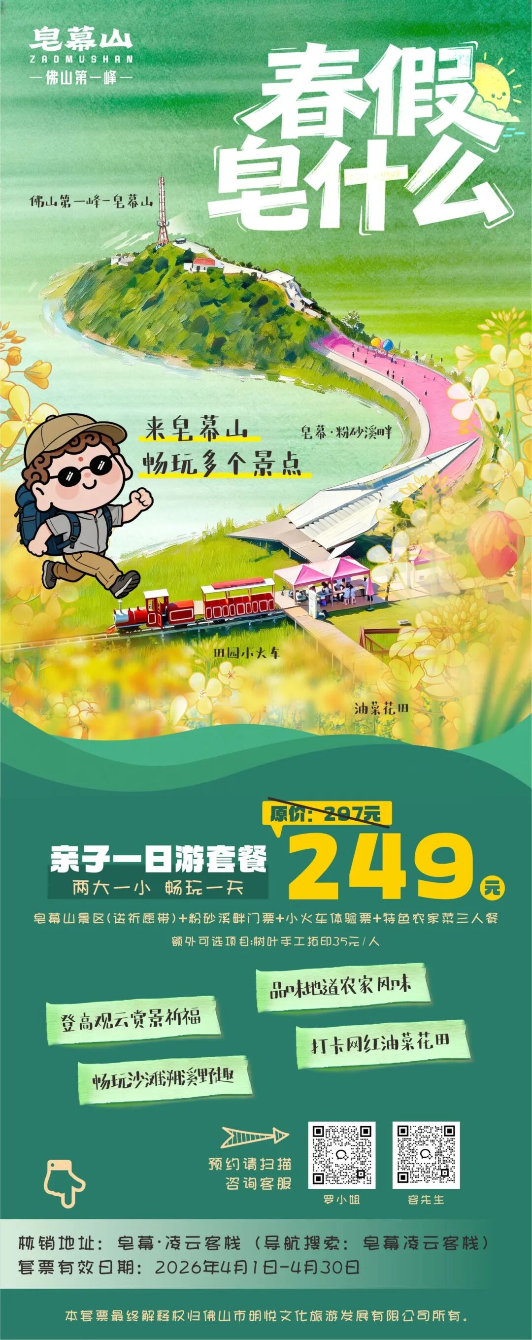 还在为春假带娃去哪玩发愁?皂幕山承包你全家的春日快乐!登高观云、祈福赏景、沙滩撒欢、油菜花田打卡…两大超值套餐任你选,省心又划算,快来解锁完美假期吧!