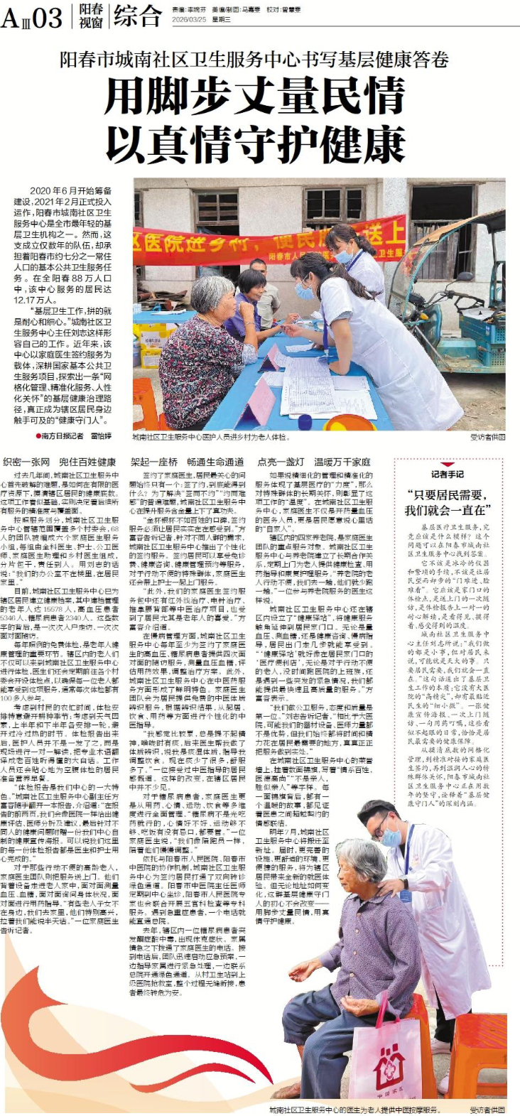 从摸清底数的网格化管理,到精准对接的家庭医生签约,再到温润人心的特殊群体关怀,阳春市城南社区卫生服务中心正在用数年的坚守,诠释着“基层健康守门人”的深刻内涵。