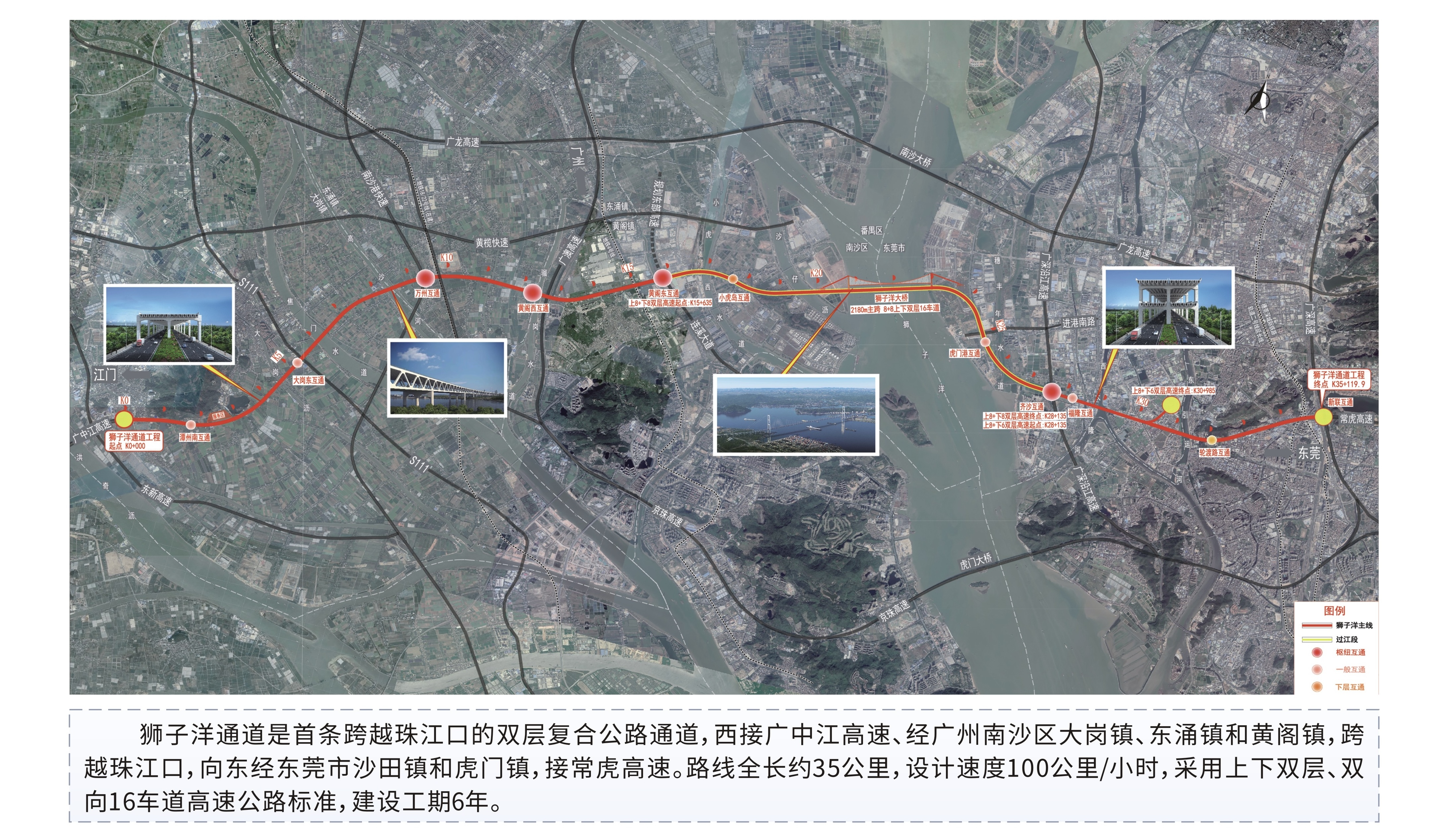 狮子洋通道全长35公里,主体工程由跨江主桥狮子洋大桥及两岸引线工程组成,横跨珠江口“A”字形顶端的咽喉要道,连接广州南沙区和东莞沙田、虎门两镇。