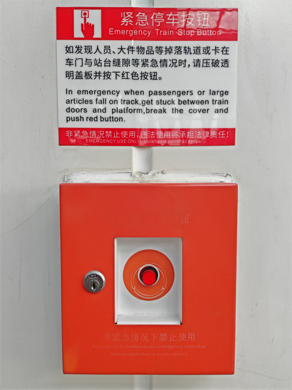 车站站台设有“紧急停车按钮”,如发现人员、大件物品等掉落轨道或者卡在车门与站台缝隙等紧急情况时,请压破透明盖板并按下红色按钮。注意!该设备非紧急情况下是禁止使用的!
