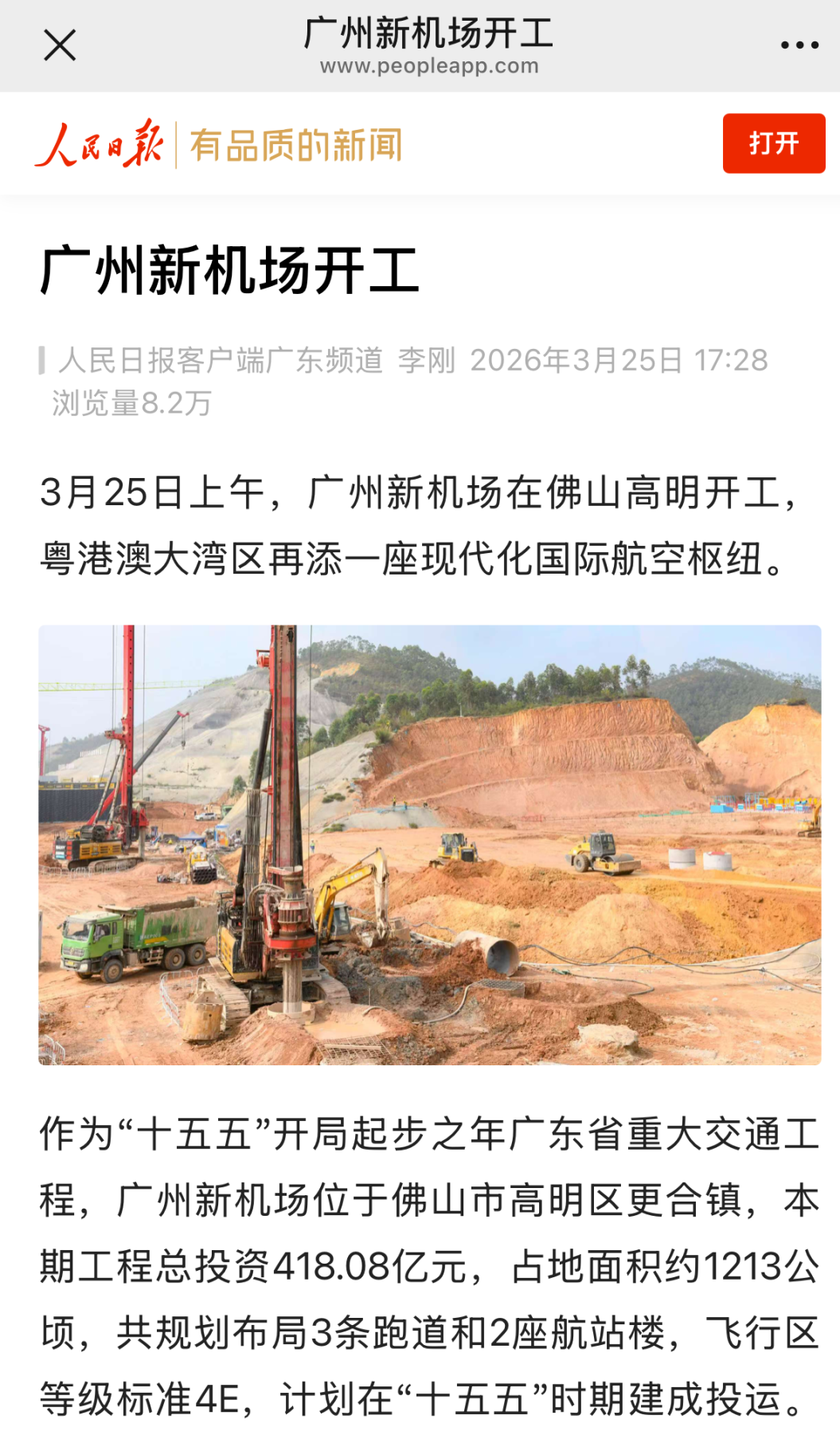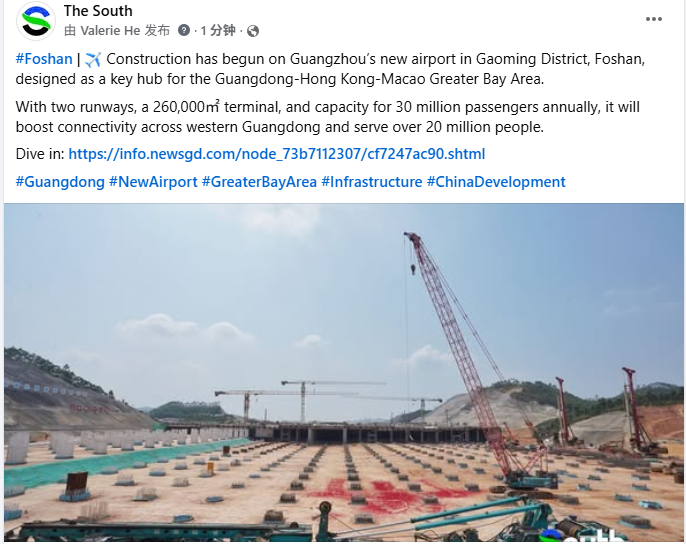 同时,广东新机场高明动工新闻登陆人民日报、新华社、央视新闻、大公文汇报、广东《新闻联播》、南方日报Facebook账号、INFO Guangdong等国内外多个平台。