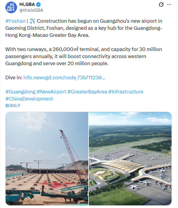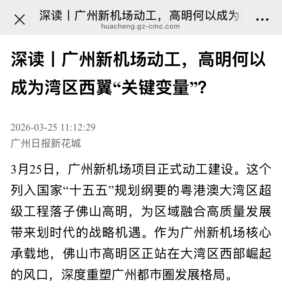 选址于佛山市高明区的广州新机场,地处佛山、肇庆、江门、云浮四市地理中心,直接服务广佛肇及周边城市超过2000万人口,提升区域航空服务能力及覆盖水平,完善大湾区西部综合交通运输体系,既是满足未来航空需求的“增量工程”,更是优化区域资源配置、促进协同发展的“关键工程”。
