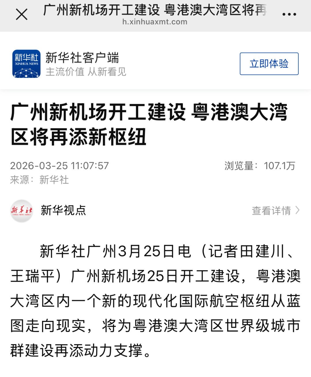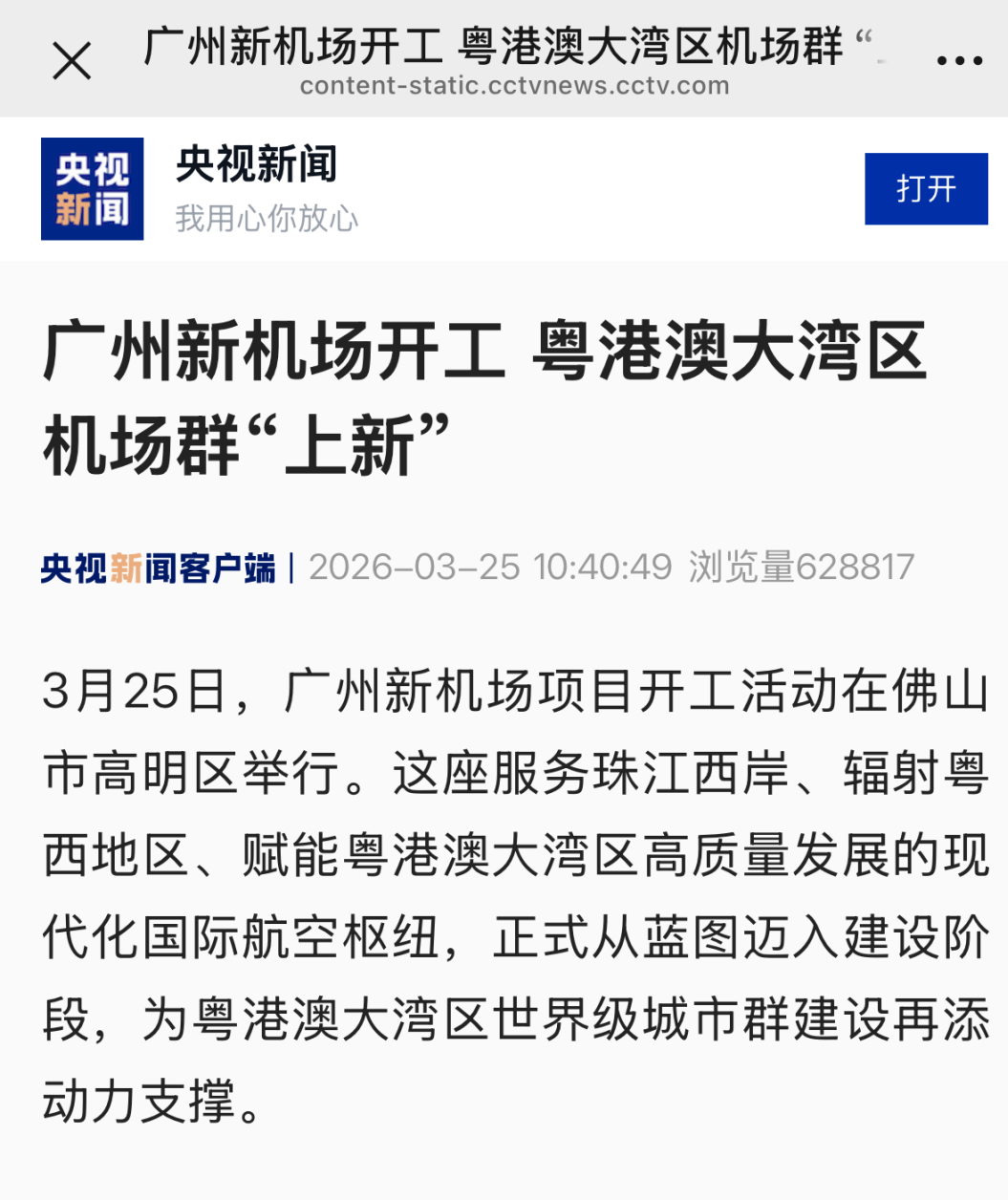 央视《新闻直播间》播出的“广州新机场开工 大湾区机场群‘上新’”主题报道,深入聚焦新机场选址在佛山市高明区,旨在优化粤港澳大湾区机场群东强西弱的格局,为大湾区世界级机场群补齐关键拼图,探索协同发展新模式。