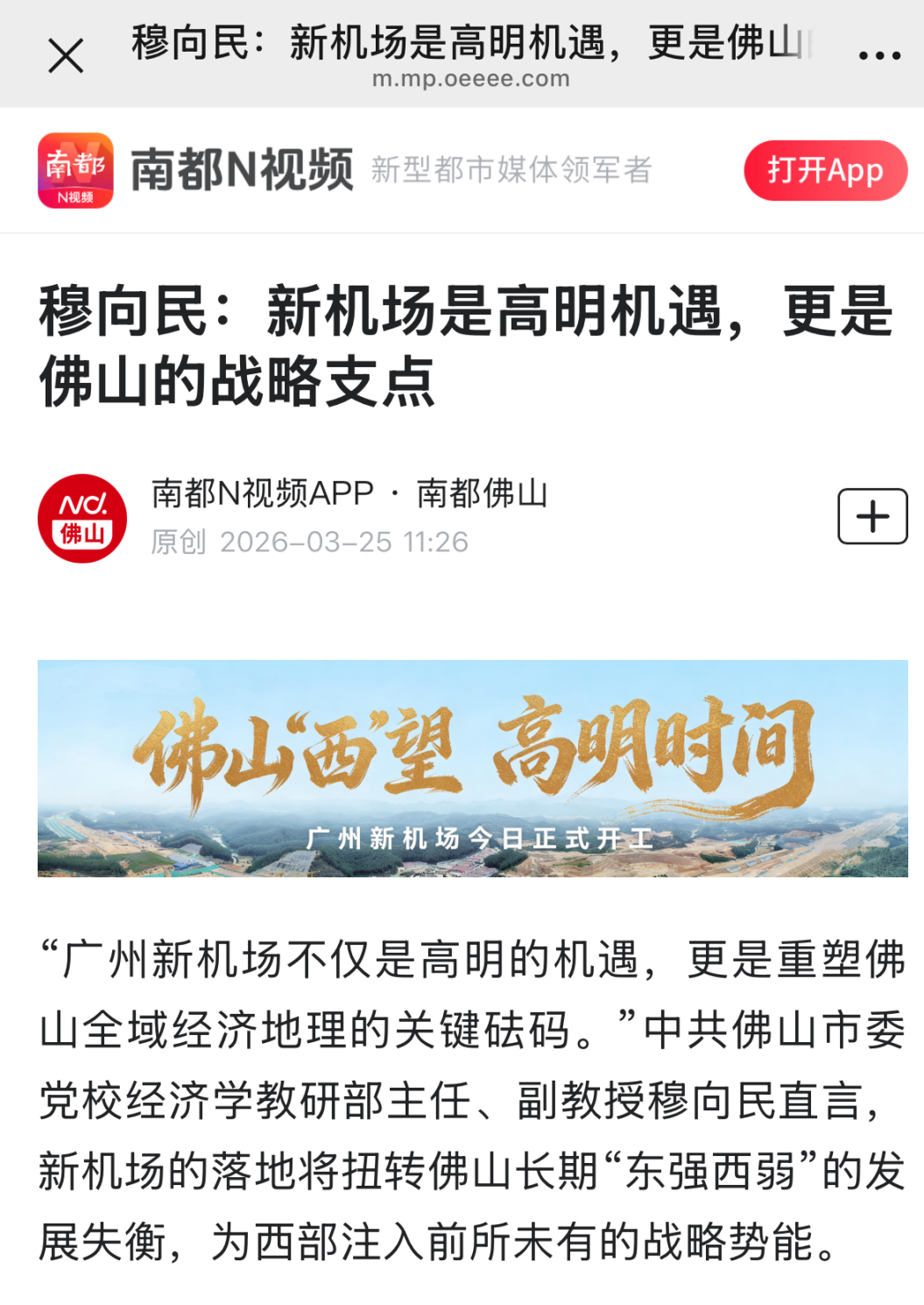 央视《中国新闻》栏目,亦深入介绍了广州新机场在佛山市高明区开工建成后,该项目还将引入广湛、深南、珠肇等多条高铁干线构建高速与快速路网,实现航空与多种交通方式无缝衔接。