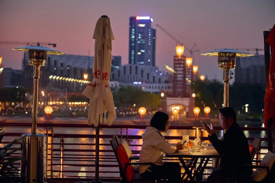 在千灯湖畔的威士忌主题街区,市民赏湖景、品美酒。