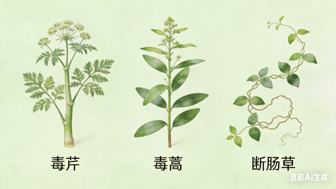 普通人亲近自然、享受田园生活时,千万不能随意采食野菜。常见的容易被当做野菜的有毒植物,主要有毒芹、毒蒿、断肠草等,它们外观分别与水芹、艾蒿、金银花非常接近,极易混淆。
