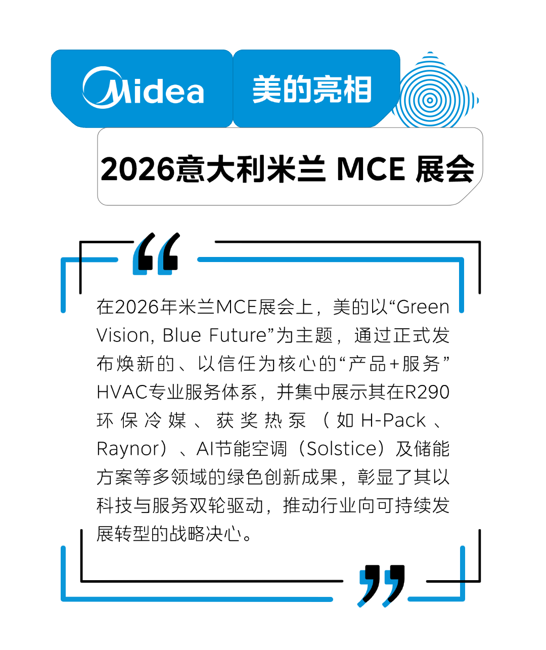 在意大利米兰举办的 MCE 2026 展会上,美的以“Green Vision, Blue Future”为主题,集中呈现最新可持续暖通解决方案,并正式发布焕新的美的 HVAC 专业服务体系。这一举措不仅彰显了美的在绿色创新上的持续投入,更标志着其坚定迈向“产品+服务”全生命周期支持制造商的战略决心。