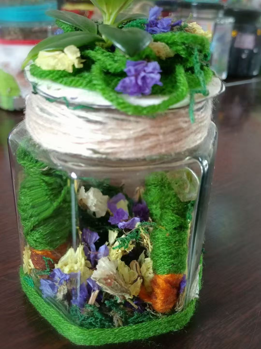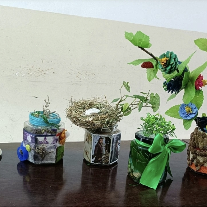 利用废弃瓶罐、纸盒等可回收材料制作花器,搭配春日野花野草进行创意插花。