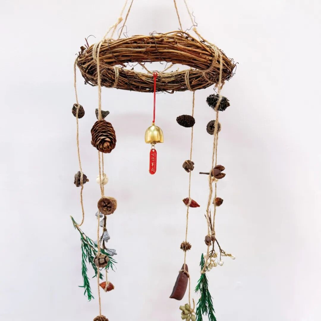 利用树枝、松果、干花、树叶等材料,搭配细绳和铃铛,聆听风的声音,感受满是春天的气息。
